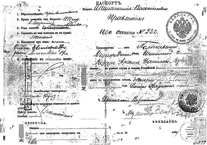 Passport issued to Arhip Kuz on December 23, 1915. It says: name - Kossak Arhip Danilov Kuz, Religion - Russian Orthodox; Date of Birth - March 6, 1877; Profession - lettering; Married. Passport issued in the Village of Shishaki, Shishaki volost', Mirgorod uezd, Poltava gubernia.